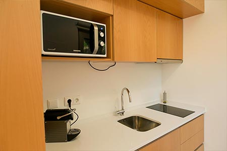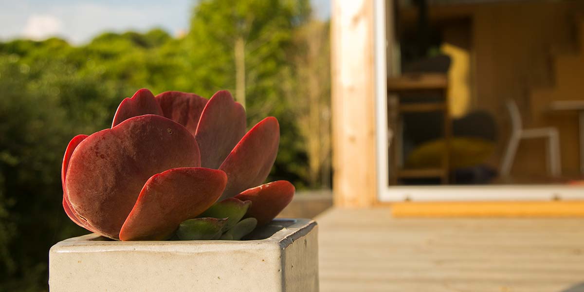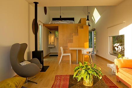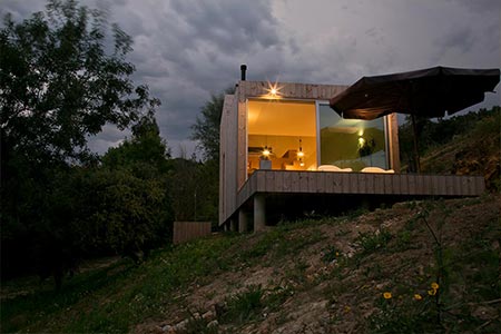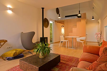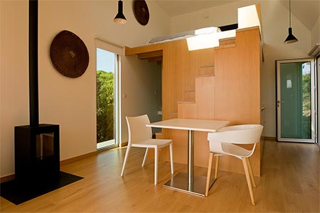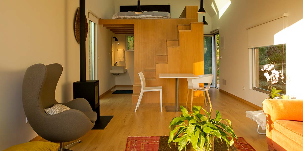 The house is located in a lowered terrace by the biological swimming pool. The access is done exclusively on foot, the car being parked in a higher terrace. With 32 m2, the Wood House has a spacious living room, a bathroom and a kitchenette equipped with fridge, cooker, microwave oven, coffee machine and electric kettle. In order to optimize the available space, the king-size bed was set in a high mezzanine accessible by a staircase with alternate steps that has no handrail. The water heating is provided by a solar panel and in the winter the interior heating depends exclusively on a small, forged iron, wood burner stove. The living room extends to the outside by a wooden deck raised from the ground that is the ideal place to have meals or just to profit of the sun.